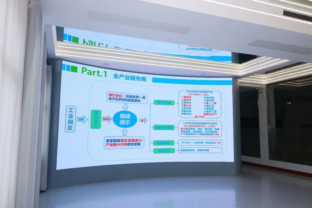 考察团此行的最后一站,走访了氟化工行业的领军企业---福建德尔科技股份有限公司。德尔科技是一家拥有核心自主知识产权的国家级高新技术企业,产品主要应用于半导体芯片、面板、光伏、特高压、重大电力装备、新能源和航空航天等战略新兴产业,并以其全产业链布局和丰富的含氟新材料产品,赢得了市场的广泛认可。
