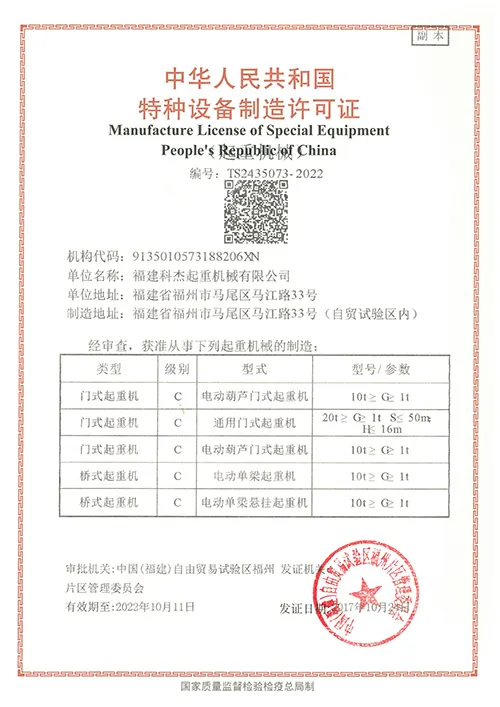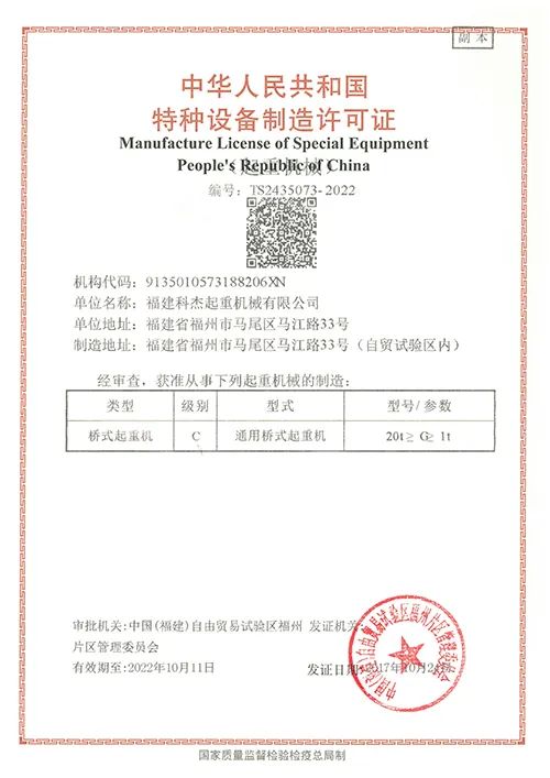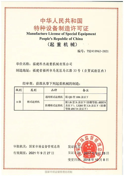 2017-2021年起重特种设备制造许可证TS2410962 |